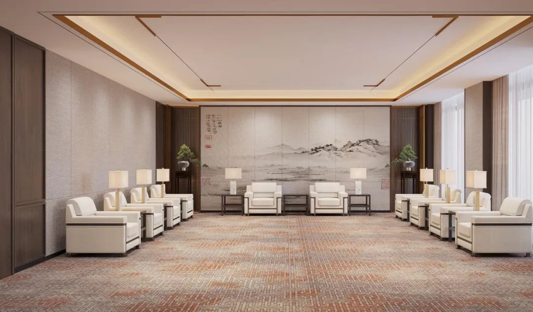 山水画是中国人情思的沉淀,浓墨重彩、云淡风轻的山水画将办公室呈现出意境和气韵,同时在中式的古典结构之上结合现代、简约、雅致的空间风格,延续新中式的可持续风格。