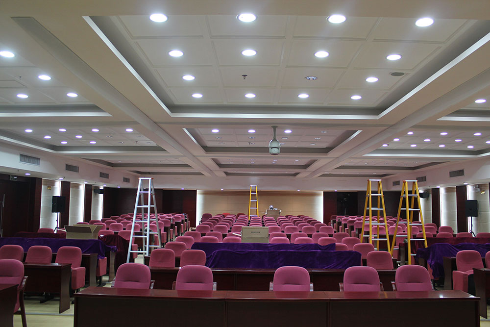 图:项目改造使用Geosheen极成光电GT4150防眩天花筒灯,使用10W LED光源,4000K中性色温,高显色性Ra≥90,无频闪,无眩光,替换原有26W节能筒灯,满足主席台800 lx、观众席500lx的照度和空间垂直照度的均匀性,符合会议摄像要求,营造出舒适的会议空间,节能高达60%