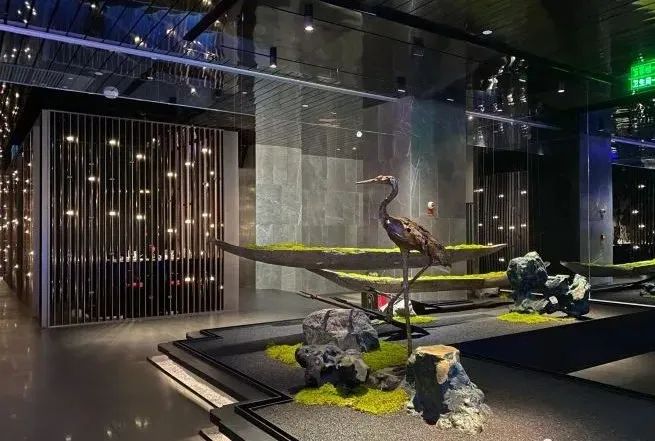 顶上使用嵌入式筒灯做重点照明,暗藏的灯带为辅助照明,两者结合使空间的氛围感一下提升起来,当一束束灯光打在仙鹤上、凹凸的墙壁上,能为顾客打造富有真实感的自然世界。
