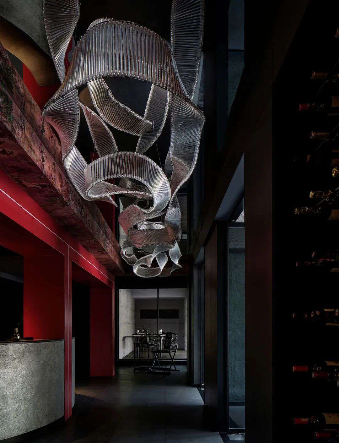 大厅内厚重鲜艳的中式红柱于黯黯处